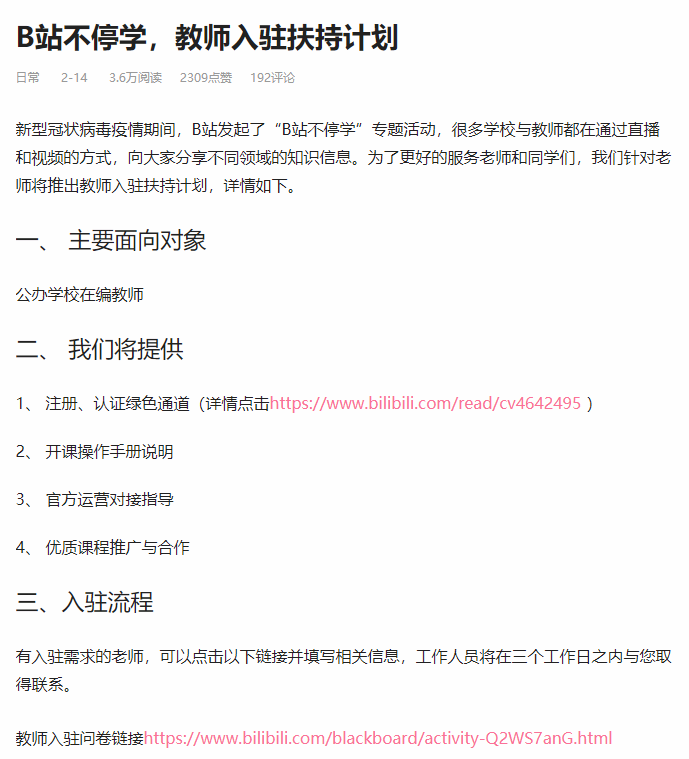 B站还针对教师、学校入驻提供了官方帮扶计划。