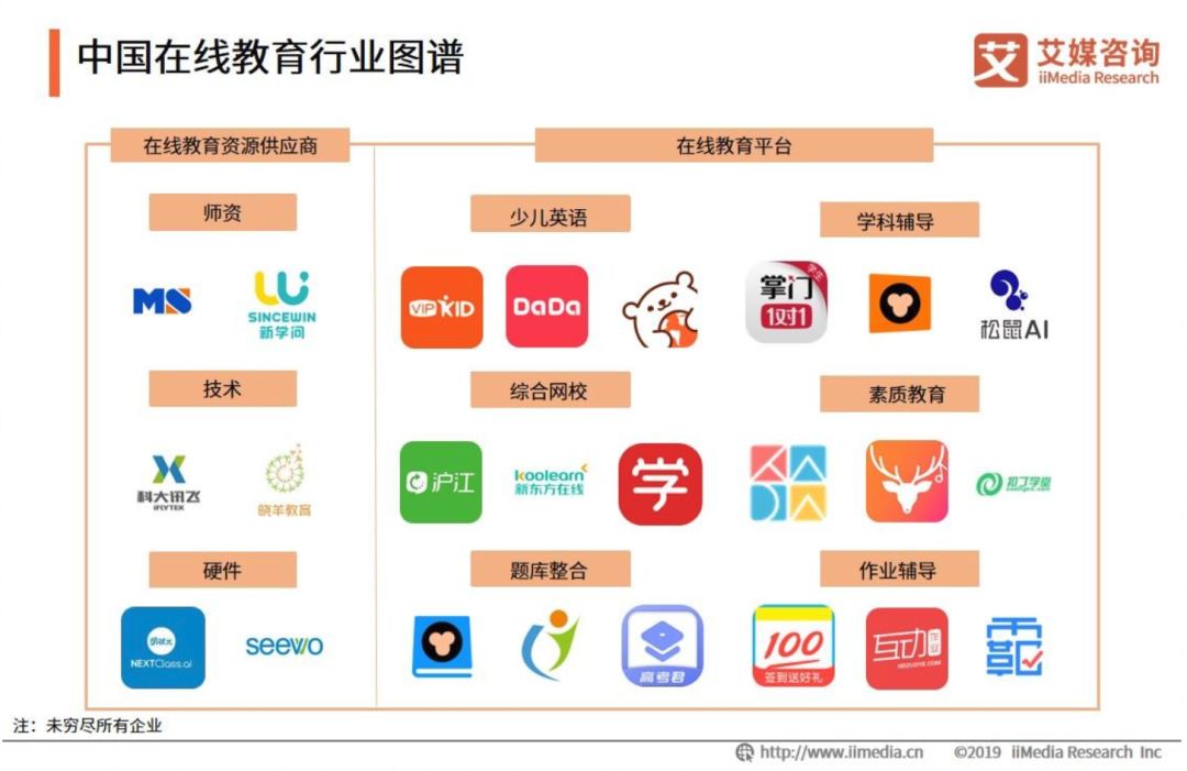 与此相对的,还有“专业平台”,也就是出生就是为了培养线上社群的平台。百度旗下产品作业帮以前有这一功能,后来估计因为我所从事的平台倒闭,感觉形势不妙,也主动关闭了这种功能。有鉴于此,截至目前,线上教育中,主要进行公益内容的UGC(用户生产内容)的平台依然很少。这里引用艾媒的《2019中国K12在线教育行业研究报告》,我们看看中国现在线上教育行业的图谱: