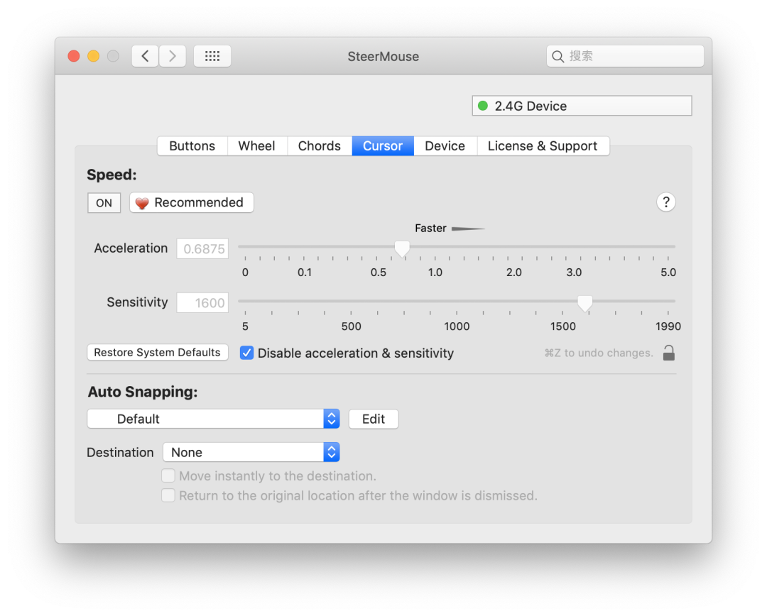 一个是如果你的主要使用设备不是触控板,而是鼠标,我估计你会觉得macos的鼠标控制逻辑非常奇怪(不只是鼠标速度慢的问题)。因为系统开启了鼠标加速,而且这项功能无法关闭。解决办法是装一个软件:steermouse,就可以去掉鼠标加速了。参考设置: