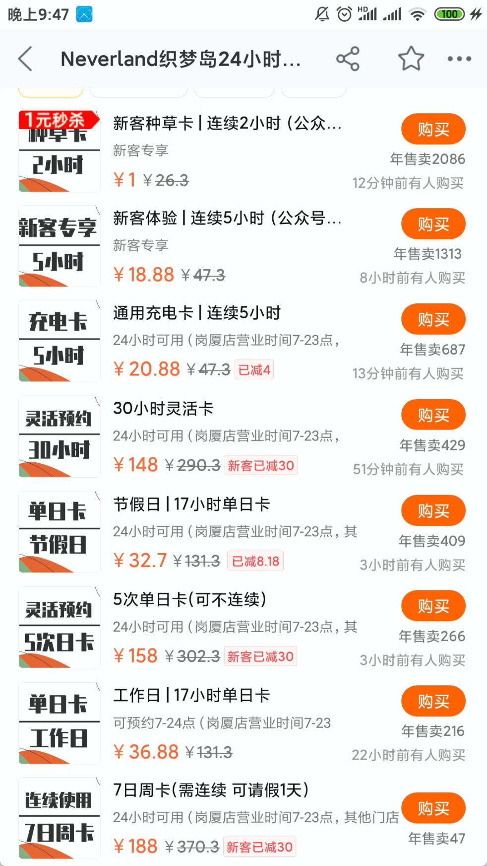 这是在美团的一个深圳自习室银牌商家的价格情况。