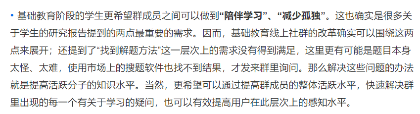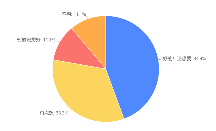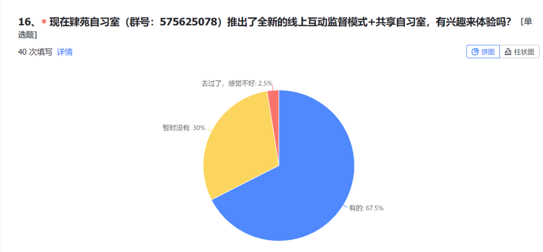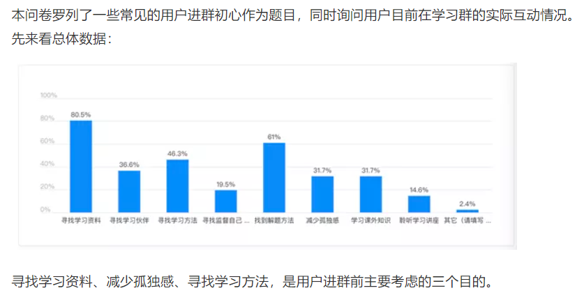 把问题改成单选以后,我发现,关于“找人监督自己学习”这个选项的占比高了许多。在以前的类似调查中我也发现了,当时用户进群的三个目的是个纸老虎,用户真正关心、我们能做到的更多是“陪伴学习”、“减少孤独”这两点。