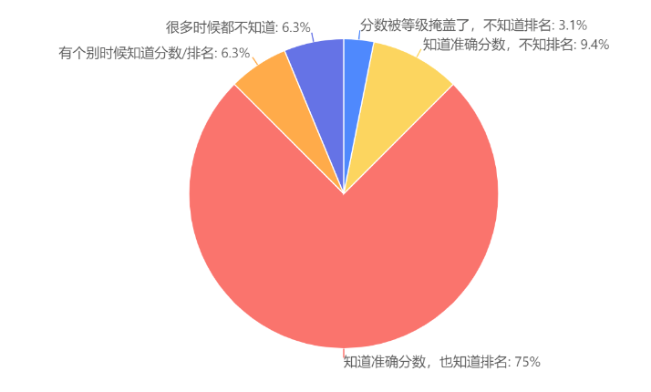 问这一问题就是看这个政策的推行程度如何,目前在本问卷中还有75%的学生可以看到考试成绩、排名,剩下已经有相当一部分同学了解不到这种重要、关键的信息了。