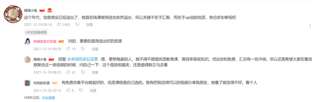 “这个年代,信息其实已经溢出了,就算在线课被筛选也依然溢出,所以关键不在于汇聚,而在于up说的优质,各位多加审视吧。”