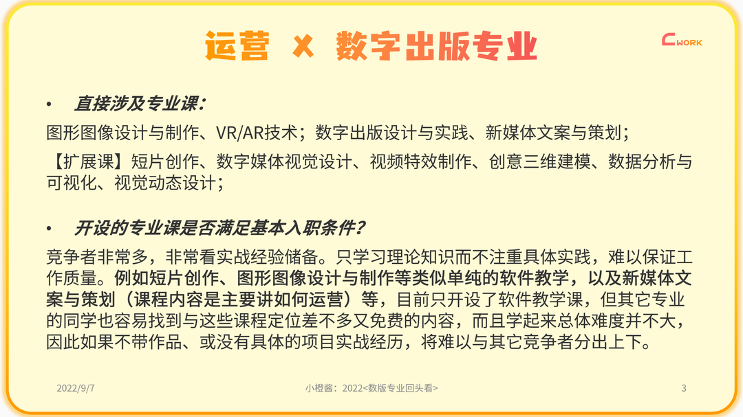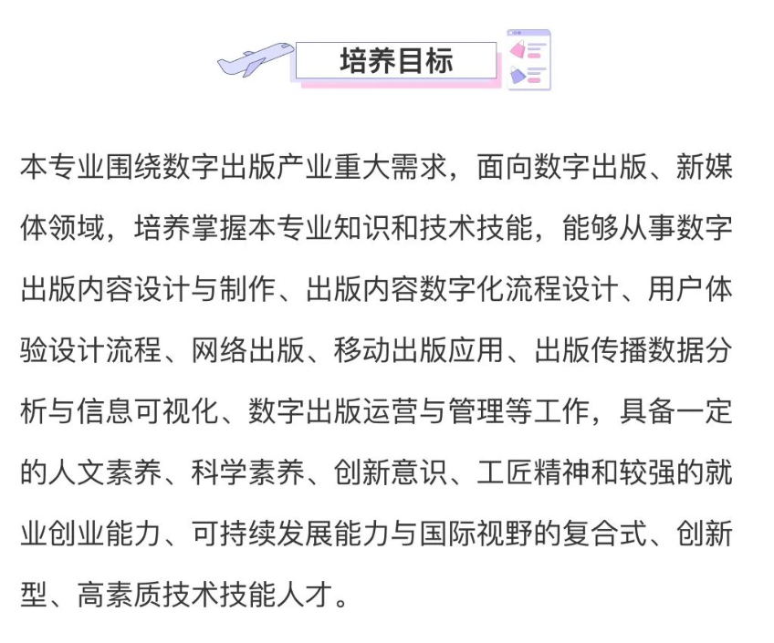最新版本的官方“培养目标”的文案中多次强调,该专业与“新媒体运营”相关的能力培养有关,而写的“主干课程”也有很多和我这一级数版同学上的课是相互重复的。但就具体实践(课程安排、课程内容)来看,该专业更注重培养互联网下的品牌运营、文案策划能力,也就是更多会去培养互联网行业的运营岗人才。