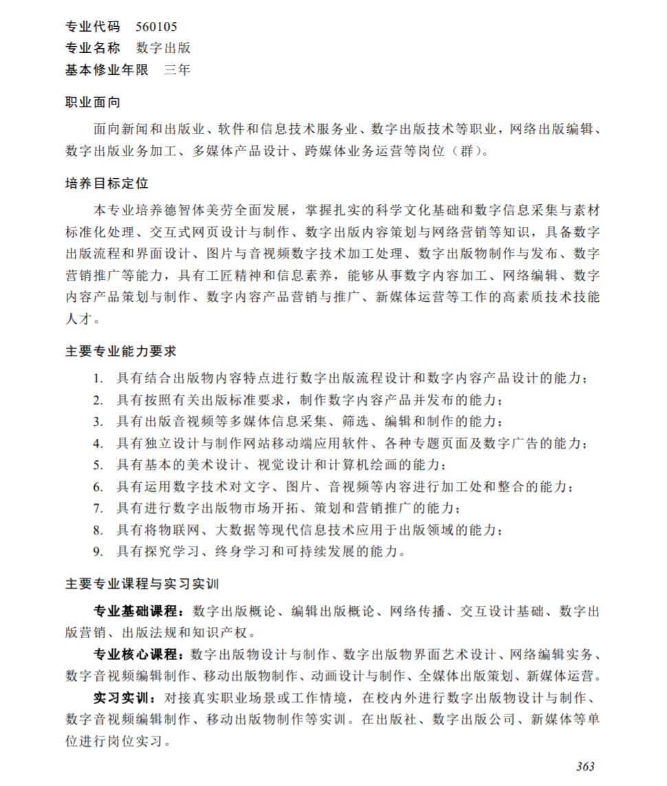 教育部于2022年9月5日发布的《职业教育专业简介(2022年修订)》[6]文件中对数字出版专业的表述(如下图):